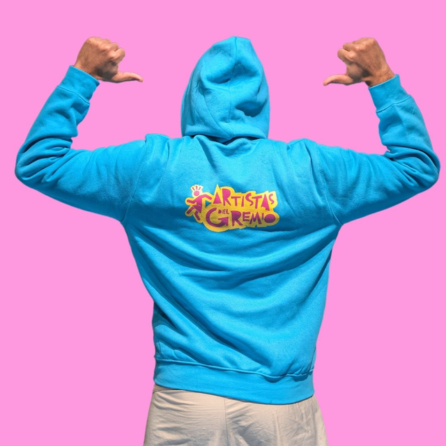 Sudadera azul cian con capucha y bolsillo canguro. Abriga cuando refresca y hace sudar cuando hace calor.